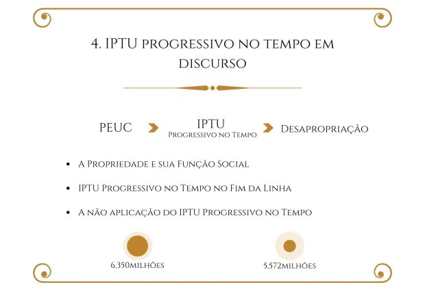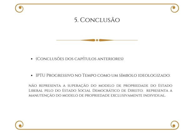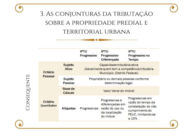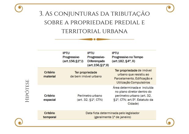 ABSTRACT: This dissertation that aims to analyze the progressive Urban Property Tax (IPTU) over time from a discursive perspective. Therefore, it presupposes: Law as a language, whose interpretation passes by the syntactic, semantic and pragmatic levels of language analysis; the Constitutional Principles of Equality, Ability to Pay, Progressivity, Confiscatory Effect Prohibition, and Protection of the Existential Minimum, as applicable to the IPTU; and the Tax Norm Theory. Then, it locates the three conjectures of this tax in the Federal Constitution: that of the art. 156, §1, I; that of art. 156, §1, II; that of art. 182, §4, II. It comprises, and proposes, based on the Tax Incidence Matrix Rule, the following IPTU conjunctures: the progressive IPTU; the progressive-differentiated property tax; and the progressive IPTU over time; the last two being predominantly non-fiscal, and the first one, predominantly fiscal. It identifies the progressive IPTU over time discourse, which seeks to encourage the fulfillment of the social function of property, as well as the link with the Democratic State of Law as the constitutional option for the meaning of property. It denounces, however, that, by the lack of application of the progressive IPTU over time, this tax becomes an ideological symbol, signifying the success of the conception of property of the Liberal State to the detriment of that constitutional option by Democratic State of Law.